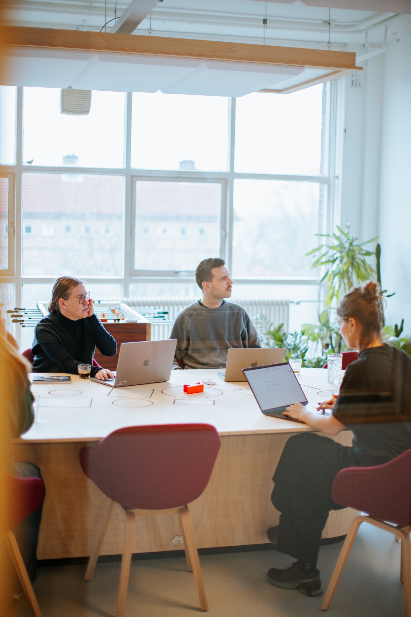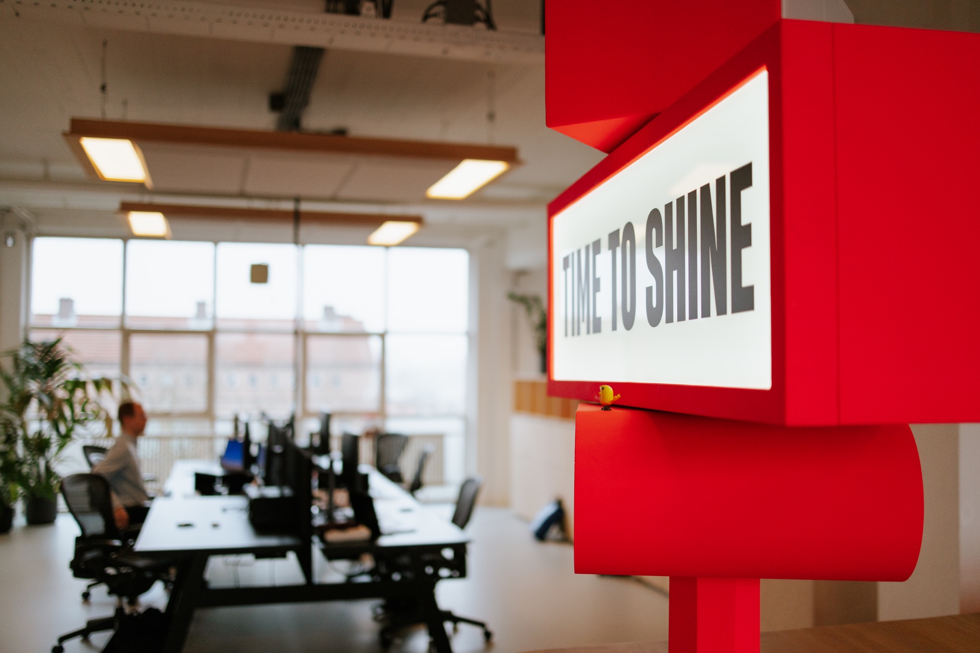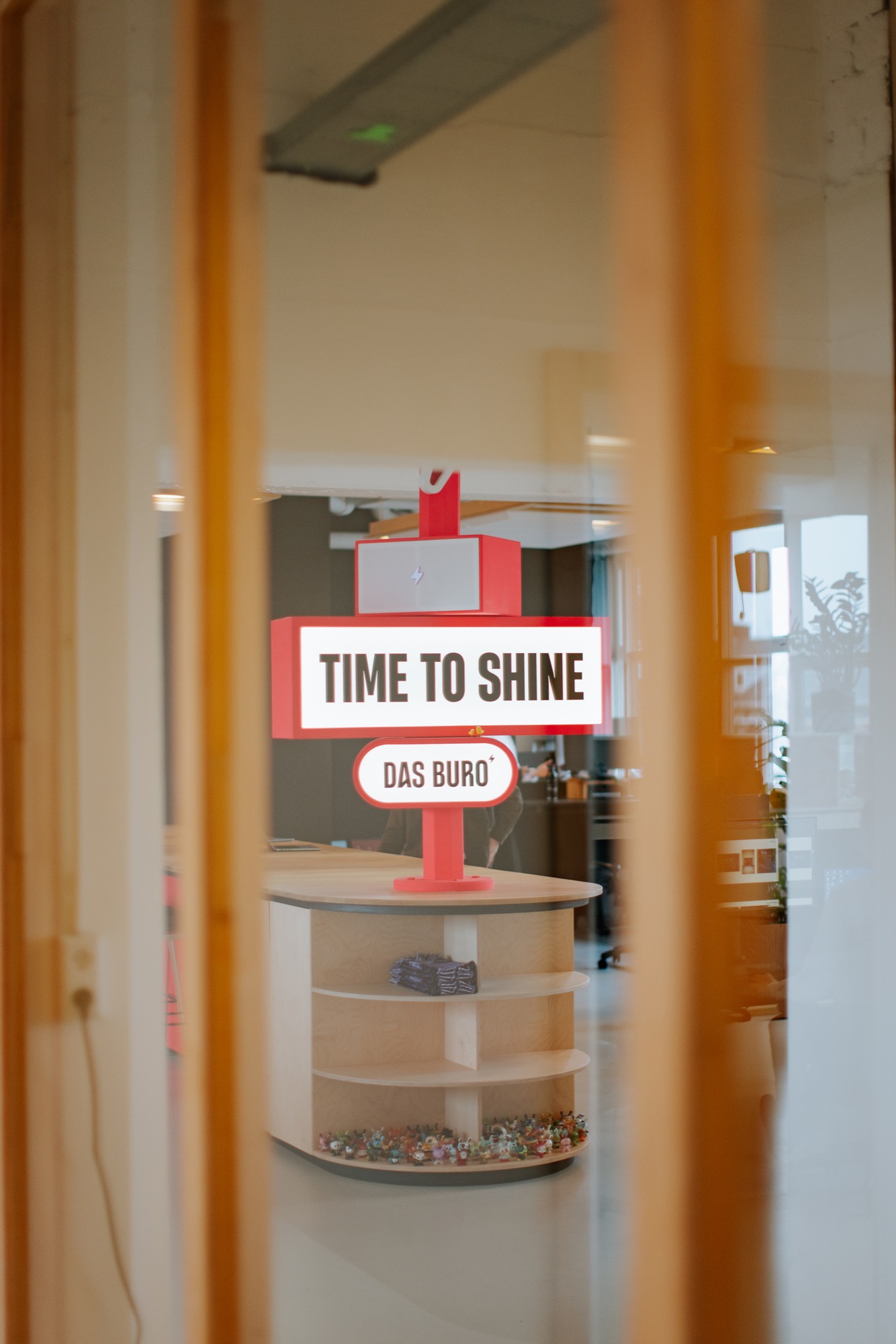Een zes meter lang massief eiken blad biedt ruimte om te lunchen, vergaderen en werken met het hele team. Ingebouwde opbergkasten, een koelkast en slimme indeling zorgen voor functionaliteit. Maar het meest opvallende is de enorme lichtmast die boven het meubel uittorent: voorzien van lichtbakken, speakers en natuurlijk… neon roze. Alles in lijn met hun motto: “More rock, less talk.”